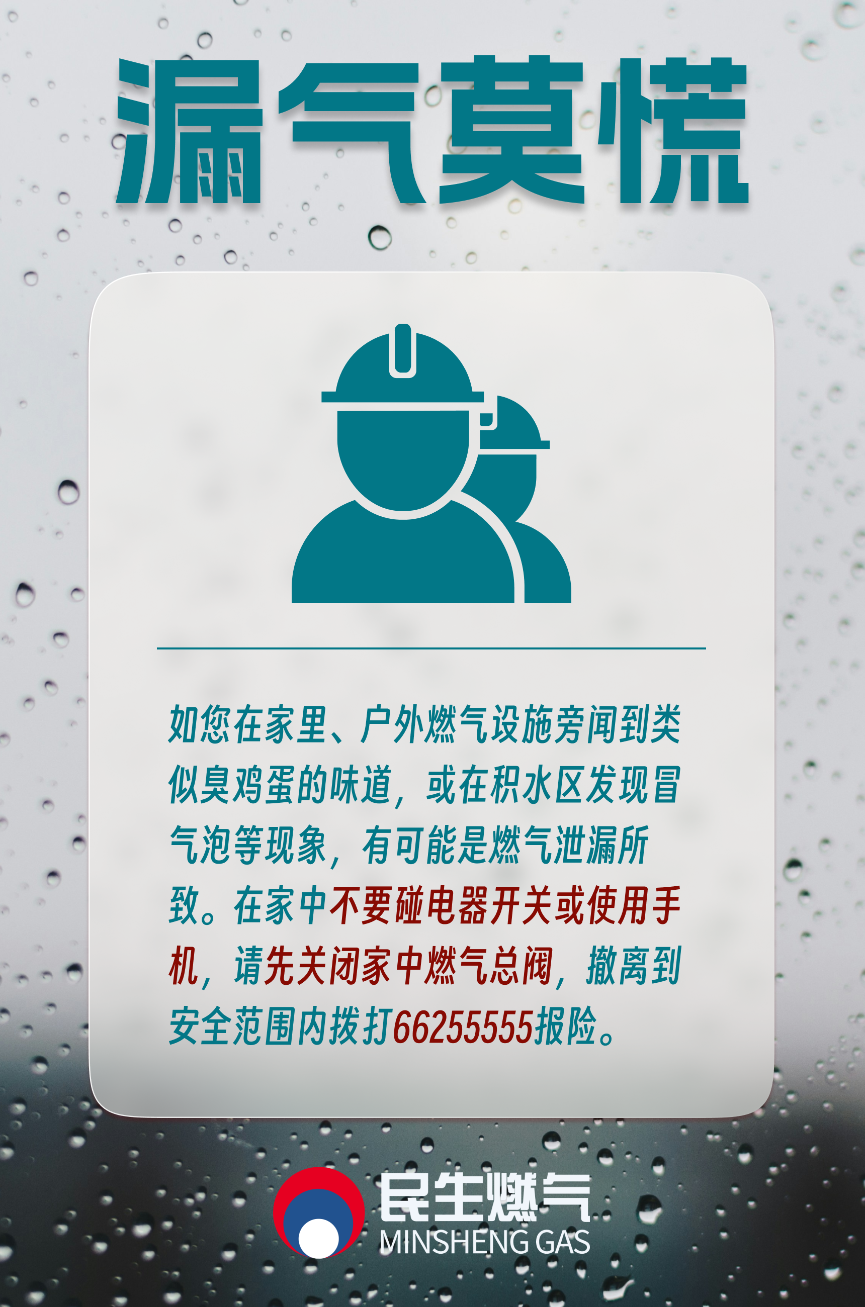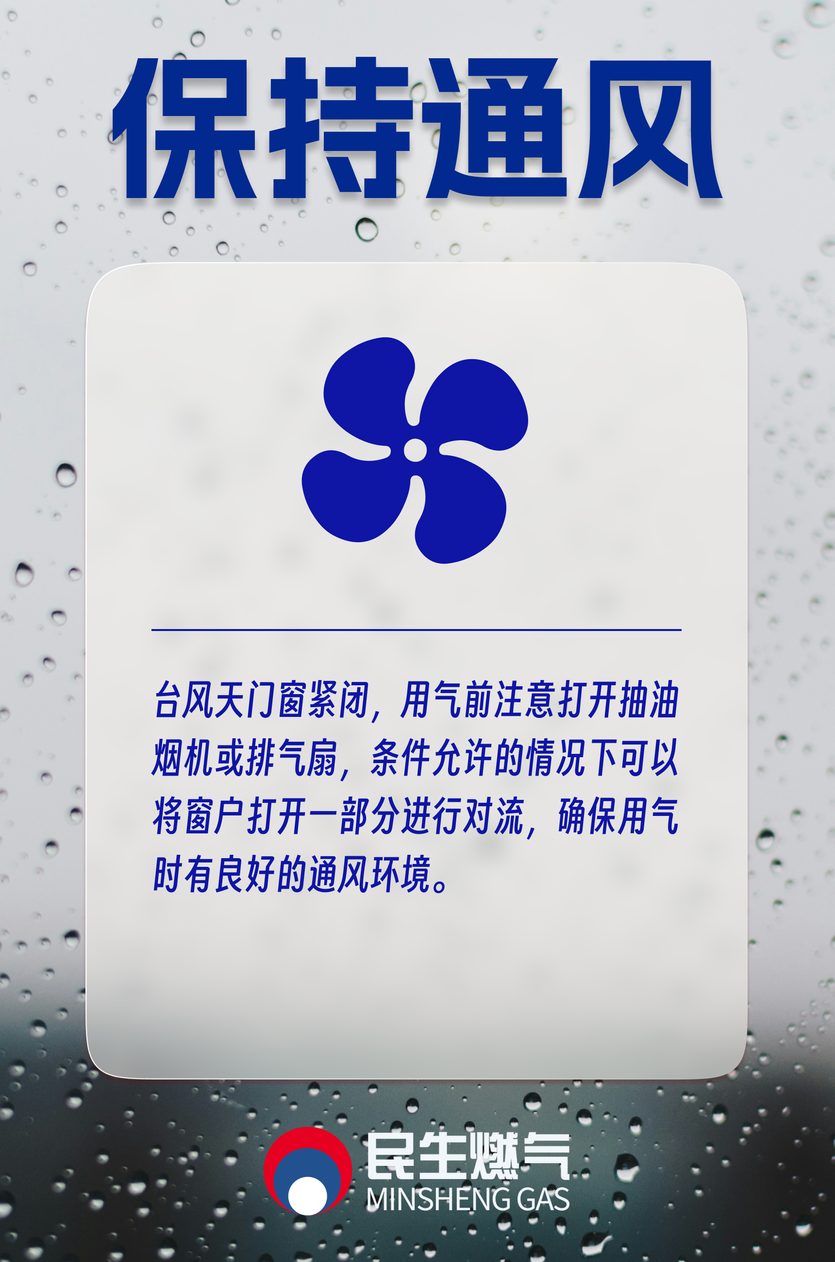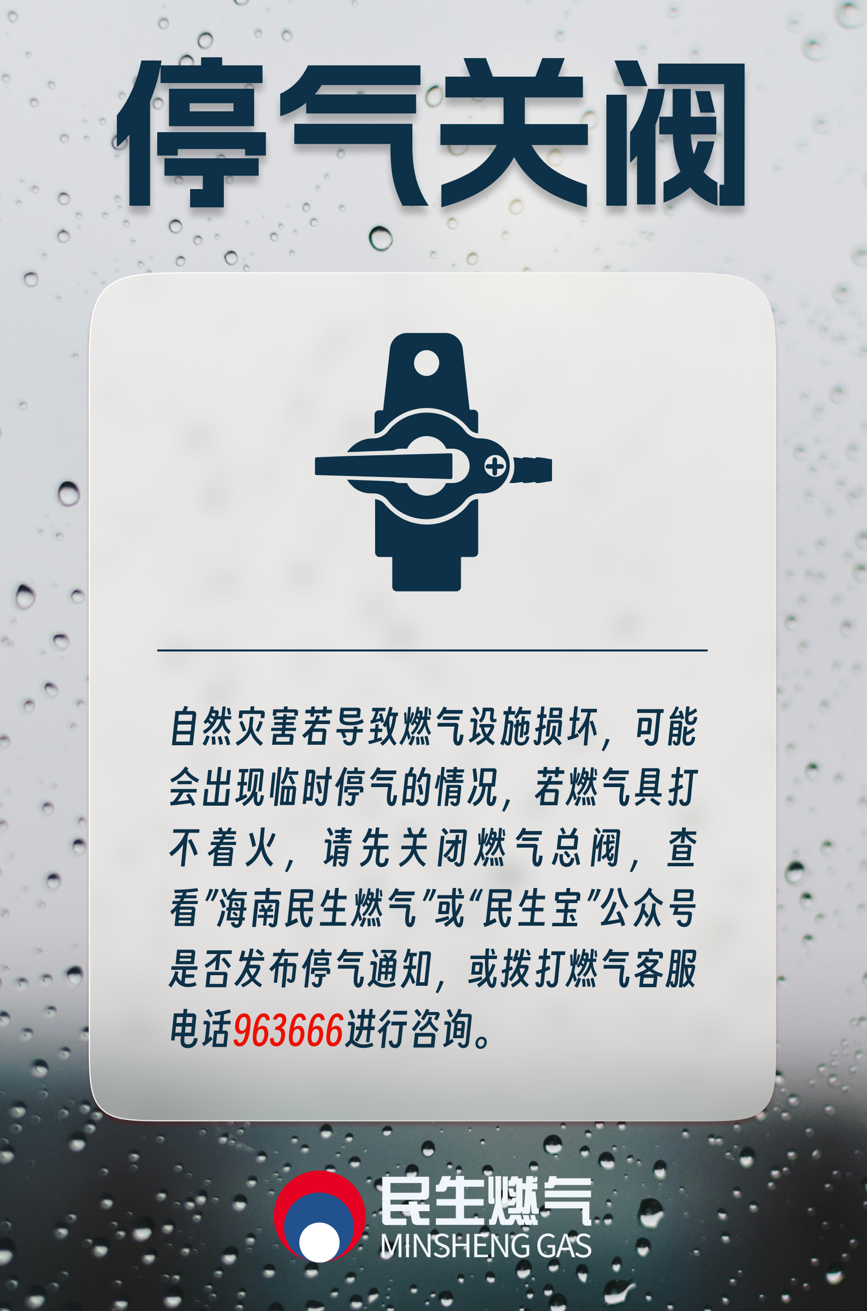為確保臺風期間廣大用戶日常生活用氣需求和用氣安全,海南民生燃氣提醒請您,根據需求提前做好充值購氣和安全防范。風災期間一旦發現用氣異常情況,請立即撥打公司24小時服務熱線963666或66255555聯系專業人員進行維修。